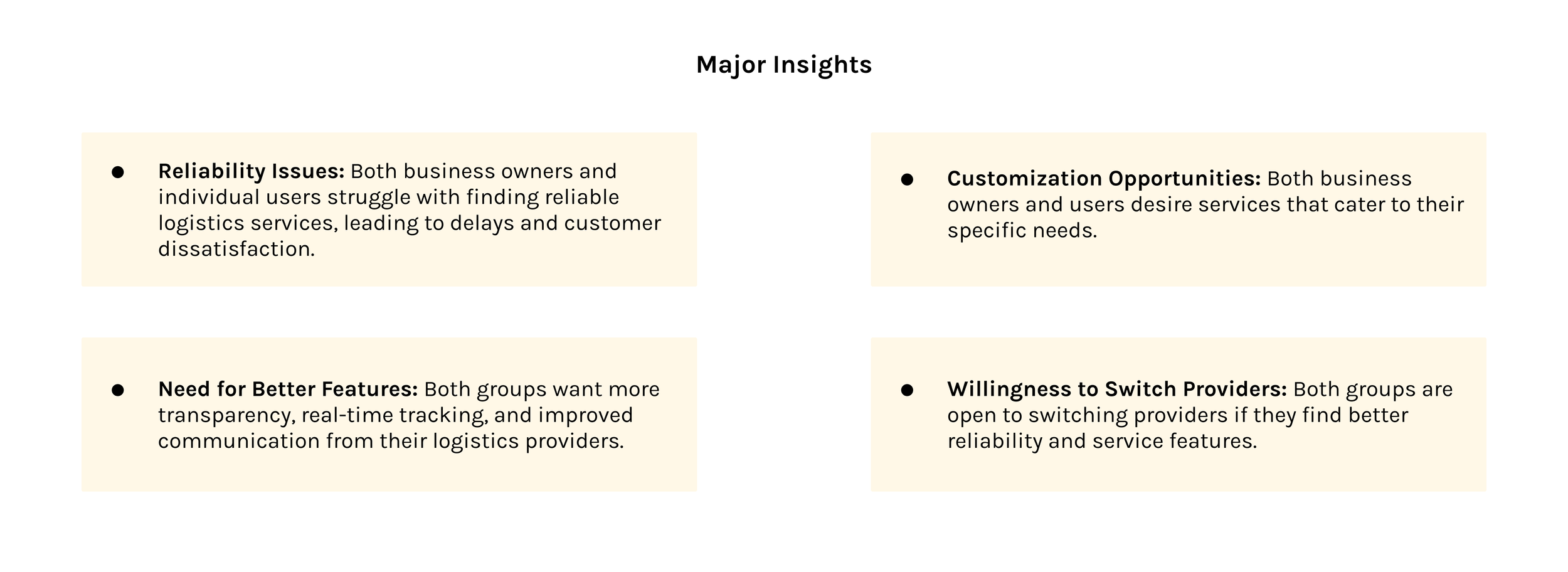 We interviewed 5 business owners and 5 individuals who frequently use delivery services but have struggled to find the best logistics solution. We asked them several questions to understand the challenges they face and then organized the data using affinity mapping.